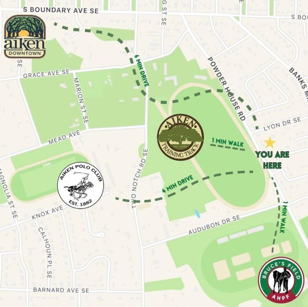 Welcome to Canter Cottage! Located directly across from the Aiken Training Track and around the corner from Bruce's Field, this charming brick one-level home is a rare find nestled between downtown Aiken and the Historic Horse District. Watch the horses train from your front window, walk to Powderhouse polo field or Aiken Horse Park - live at the center of it all! The 3BR/2BA home has original hardwood floors and designer lighting, new curtains and blinds, spacious living room, updated kitchen with butcher block counters, tile backsplash, newer appliances, and dining area with built-ins. Down the hall is the primary bedroom with two closets, en-suite bath with charming equestrian-themed wallpaper, two guest bedrooms and freshly painted hall bath. Bonus four season/sunroom is heated and cooled with a wall of windows overlooking the large, fenced backyard, which has a lovely patio and room for pets or a pool. Recent updates include new HVAC (2023), new hot water heater (2024), vapor barrier and insulation, decorative white equestrian fence in front, cedar stained privacy fence in backyard, new sod, plus pebble circular drive with room to fit a horse trailer or additional guest parking. Extensive new landscaping and plantings have been done- azaleas, camellias, gardenias, hydrangeas, tea olives, hollies, dogwoods and more. Please see attachments for complete list of improvements and plantings. This house would make a great forever home, seasonal residence or wonderful Airbnb with income producing potential (furniture is also available to purchase if desired!). Fabulous location in the heart of Aiken's equestrian district. It won't last long!