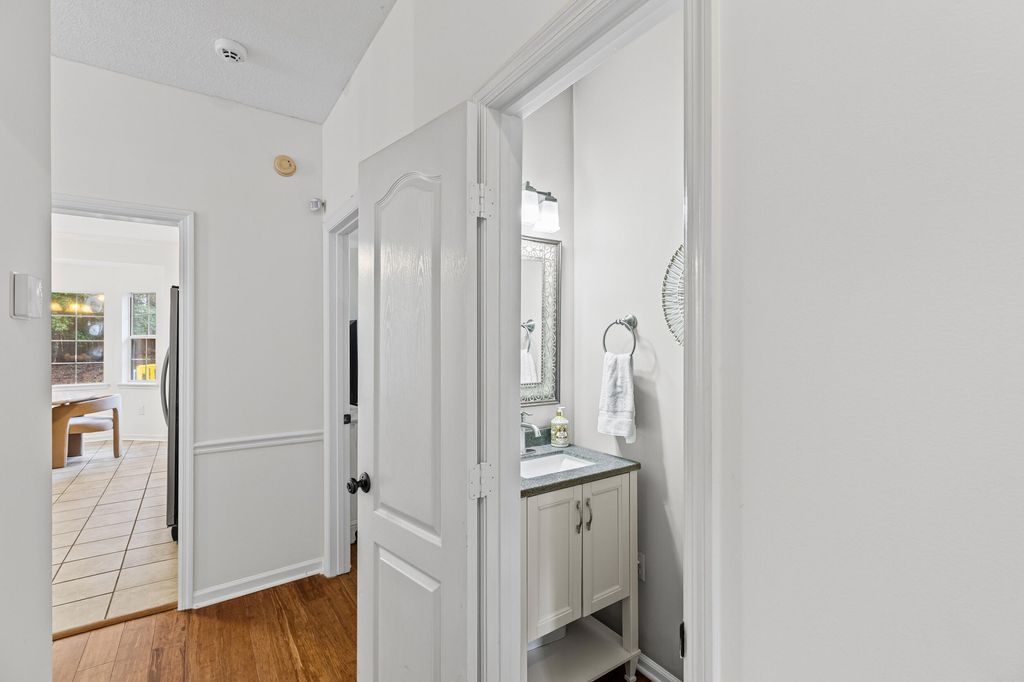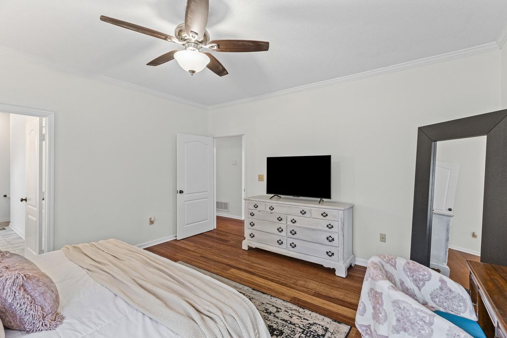 Welcome to this charming 4-bedroom home in the highly sought-after Bergen Place neighborhood! Offering a perfect blend of comfort, natural light, and functional design, this beautifully maintained property features a primary suite on the main level, making it ideal for convenience and privacy. Step inside to a bright and inviting two-story living room, showcased by soaring ceilings, skylights, and expansive windows that flood the space with natural light. Warm hardwood floors flow throughout the main living areas, complementing the open, airy feel. The kitchen is both stylish and practical, featuring granite countertops, stainless steel appliances, ample cabinet storage, and a cozy breakfast nook overlooking the backyard. A formal dining room sits just off the living room--perfect for hosting gatherings. The spacious main-level primary suite includes a generous walk-in closet and ensuite bath with dual vanities, a soaking tub, and separate shower. Upstairs, you'll find three additional bedrooms and a full bath, providing flexibility for guest rooms, office space, or hobbies. Enjoy outdoor living at its best with a screened rear porch, ideal for relaxing year-round, plus an extended deck area perfect for grilling, entertaining, or simply enjoying your fenced backyard.