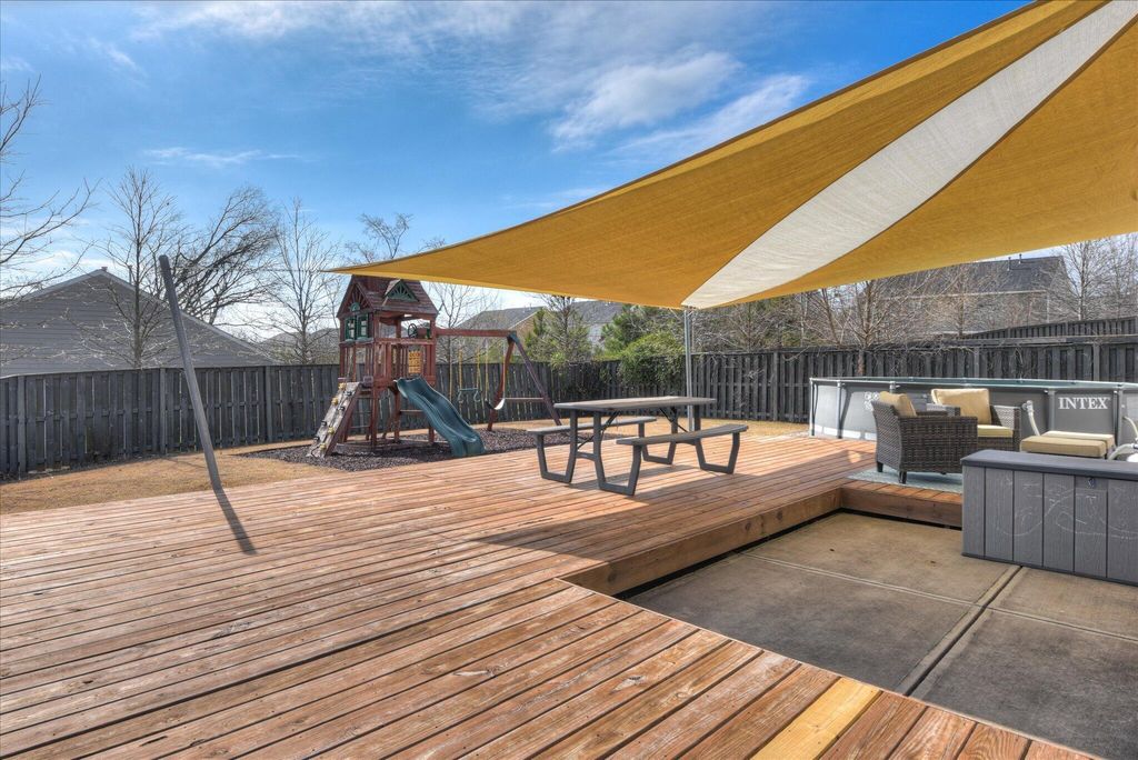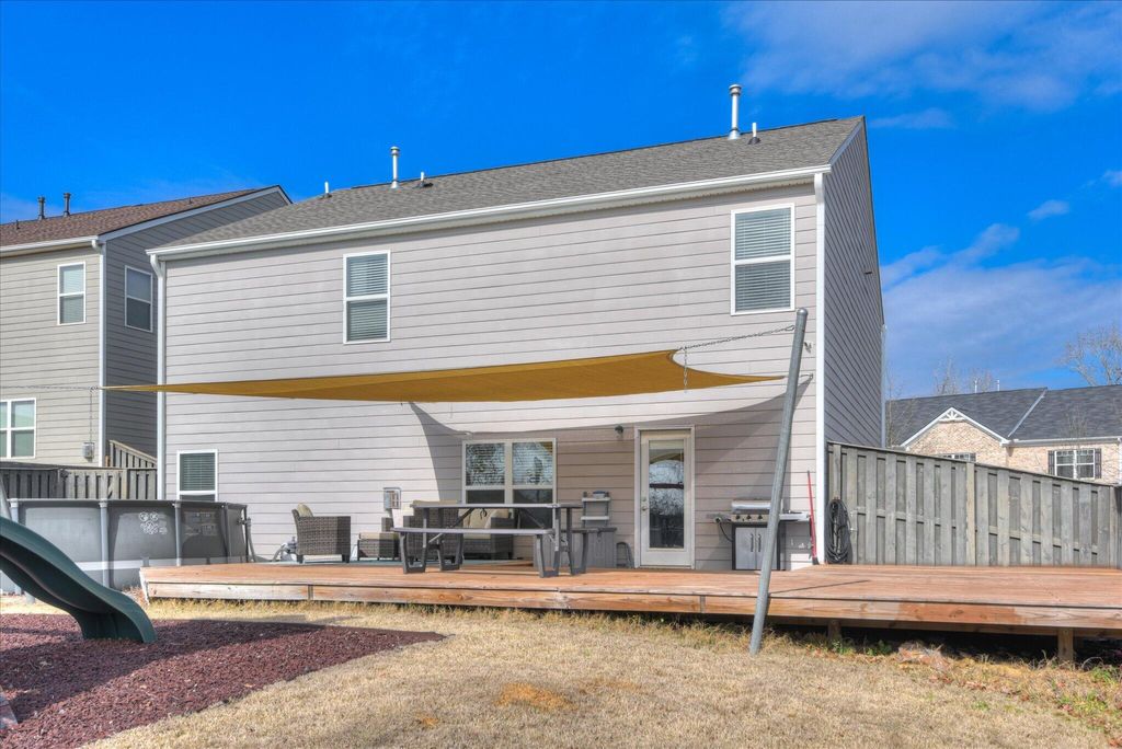 Conveniently located on Exit #1 in North Augusta, Wando Woodlands is only a short commute to Fort Gordon, downtown medical district, shopping/retail, and North Augusta's riverfront. This home is situated on a large corner lot with a private fenced level rear yard with enormous deck, play structure that remains, and an above ground pool. Inside on the main level you will find a spacious dining room, and modern kitchen with breakfast room that overlook a living area with gas fireplace. This floor also contains one guest bedroom with full bath. Upstairs features a large (20x21) Primary bedroom with vaulted ceiling and a bathroom with double vanity, garden tub, and shower. Three other bedrooms share another bath with double vanity. Laundry room is also on this level. Call today to see this home that's ready for fun and family living!